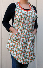 Two in one! I love these fully reversible aprons -- if one side is dirty, just turn it over. This apron features a retro cooking pattern on one side and a pretty flower pattern on the other. Both sides have two pockets. Great coverage around your hips too, and ties around the back. (Smaller folks may choose to wrap the ties around to the front.) This great apron pattern was given to women during the Depression and enabled them to make aprons out of feed sacks. Because women did not have a lot of clothes, they wore aprons to protect the ones that they had. By covering up their clothes when doing housework, it meant the clothes could be washed less and last longer. $38 |